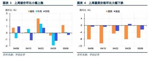 上周農(nóng)產(chǎn)品價(jià)格總體上延續(xù)下跌走勢,豬肉價(jià)格小幅上漲,蔬菜價(jià)格大幅下跌。上周五,農(nóng)產(chǎn)品批發(fā)價(jià)格總指數(shù)收于205.87,環(huán)比下跌1.64%;菜籃子產(chǎn)品批發(fā)價(jià)格指數(shù)收于208.04,環(huán)比下跌1.91%。從細(xì)項(xiàng)數(shù)據(jù)看,22個(gè)省市平均豬價(jià)環(huán)比上漲0.8%;牛肉下跌0.8%;羊肉上漲1.0%(圖表3)。上周蔬菜價(jià)格環(huán)比下跌8.14%,水果價(jià)格環(huán)比下跌0.72%(圖表4)。國內(nèi)5月生豬供應(yīng)缺口較大,屠宰企業(yè)存在一定采購壓力,壓價(jià)情緒較高,雖然部分省市儲(chǔ)備肉陸續(xù)投放,平抑市場肉價(jià),但短期供應(yīng)緊缺格局難改,國內(nèi)豬價(jià)可能小幅上揚(yáng)。隨著氣溫回暖,蔬菜供給增加,價(jià)格還有下降空間。
