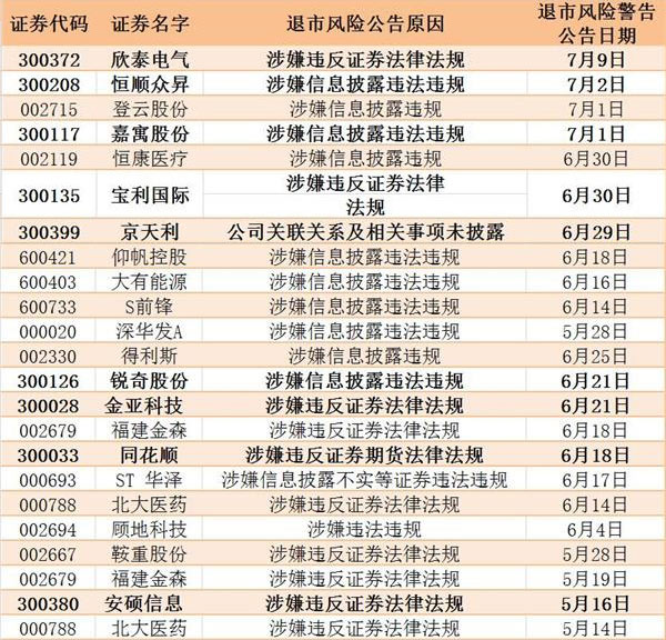 同花順因有非法經(jīng)營證券業(yè)務(wù)行為,而被證監(jiān)會立案調(diào)查,6月18日時仍在發(fā)布暫停上市的風(fēng)險警示;銳奇股份則是“涉嫌信息披露違法違規(guī)”而被立案調(diào)查,最后一份風(fēng)險警示發(fā)布于6月21日。此外,金亞科技由于公司及實際控制人涉嫌違反法律法規(guī)而被調(diào)查中,恒順眾昇、嘉寓股份和寶利國際也仍在等待證監(jiān)會的調(diào)查結(jié)果。