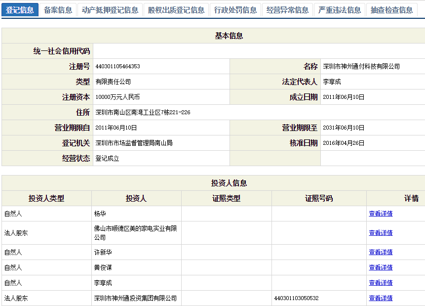 央行網(wǎng)站上的信息顯示,神州通付在2015年8月,變更了法定代表人,由年年卡董事局主席黃俊謀變更為神州通付總經(jīng)理李享成。