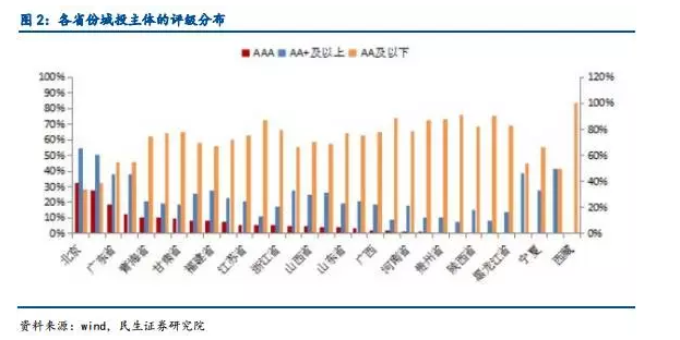 除了上述地區(qū),吉林、寧夏地區(qū)的城投也是以中高等級(AA+)為主,AA及以下的評級主體占比比其他省份(除了京、滬、廣、津)要更低一些,但沒有AAA主體。