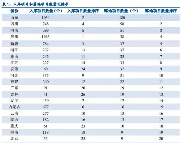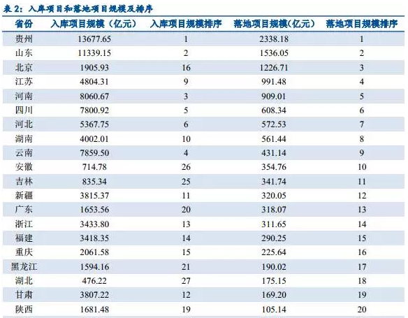 從表1可以看出,入庫項目數(shù)量和落地項目數(shù)量高度契合,入庫項目數(shù)量前五名分別為貴州、山東、新疆、四川和河南,其對應(yīng)的落地項目數(shù)量也位居前列。