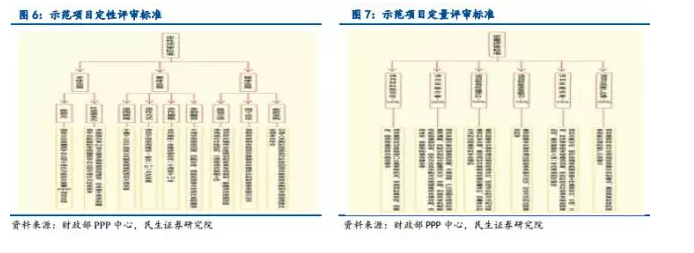 財政部示范項目由各省財政部門推薦,財政部組織專家評審選出的,項目質(zhì)量最有保障,操作最為規(guī)范。示范項目的評審標(biāo)準(zhǔn)十分嚴(yán)格,分為定性評審和定量評審兩部分:定性評審主要審查項目的合規(guī)性,包括主體合規(guī)、客體合規(guī)、程序合規(guī)三部分;定量評審是通過設(shè)定指標(biāo)和權(quán)重綜合評估項目的示范性。具體的評審細(xì)則如圖所示: