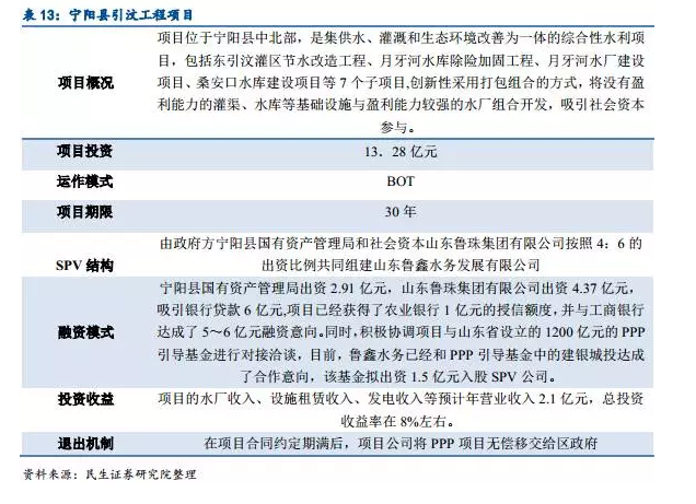 2015年5月,發(fā)改委、財政部、水利部等三部門印發(fā)《國家層面聯(lián)系的社會資本參與重大水利工程建設(shè)運營第一批試點工作方案》,篩選出12個試點項目,確加快推進(jìn)項目前期工作、加大項目投資支持力度、創(chuàng)新項目產(chǎn)品定價機(jī)制等試點支持政策,推進(jìn)PPP模式在水利工程中的應(yīng)用。
