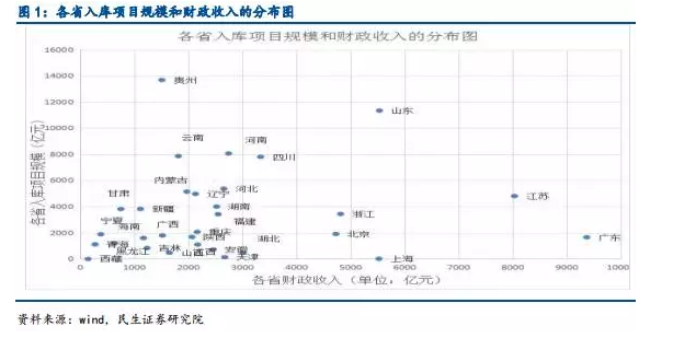 綜合上述兩個因素,市場需求巨大、財政實力雄厚的區(qū)域更合適PPP項目投資,結(jié)合上圖入庫項目規(guī)模和財政收入的分布看出,右上區(qū)域值得關(guān)注,確實,當(dāng)前PPP項目落地規(guī)模排名前十的省份分別為貴州、山東、北京、江蘇、河南、四川、河北、湖南、云南和安徽,與現(xiàn)有分布擬合度高。
