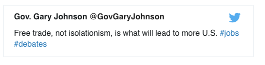 同一時間,新墨西哥州長Gary Johnson以及民主黨選民Gary Johnson對此作出反應(yīng),認為自由貿(mào)易不應(yīng)該是孤立主義。