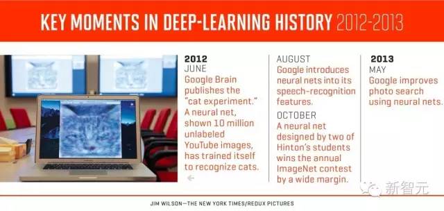 深度學(xué)習(xí)歷史關(guān)鍵點:2012年谷歌大腦識別貓臉(6月),8月谷歌將神經(jīng)網(wǎng)絡(luò)引入語音識別,10月Hinton的學(xué)生在ImageNet競賽奪冠,成績大幅提升;2013年5月谷歌用神經(jīng)網(wǎng)絡(luò)改善照片搜索功能。