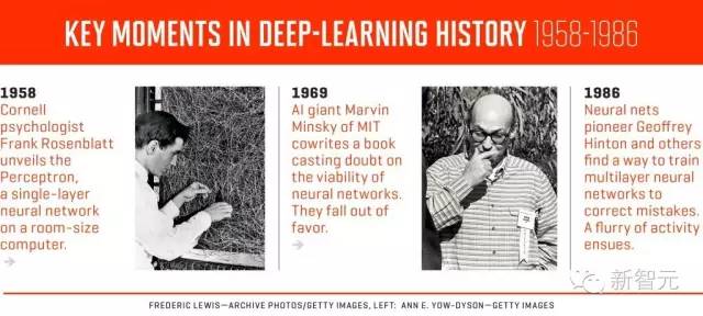 深度學(xué)習(xí)歷史關(guān)鍵點:1958年康奈爾心理學(xué)家羅森布拉特推出感知機(jī),1969年明斯基出書質(zhì)疑神經(jīng)網(wǎng)絡(luò),1986年Hinton等人發(fā)明訓(xùn)練多重神經(jīng)網(wǎng)絡(luò)糾錯的方法。