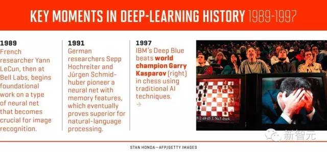 深度學(xué)習(xí)歷史關(guān)鍵點:1989年LeCun用卷積神經(jīng)網(wǎng)絡(luò)識別手寫體,1991年遞歸神經(jīng)網(wǎng)絡(luò)發(fā)明,1987年IBM深藍(lán)戰(zhàn)勝卡斯帕羅夫。