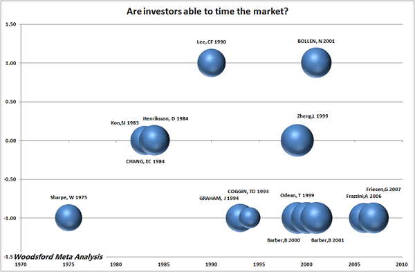 現(xiàn)在,讓我們來將學(xué)術(shù)界做過的研究綜合起來,分析一下到底投資者擇時(shí)而動(dòng)的能力有多少。