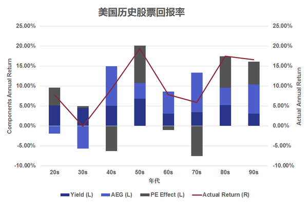 大致來講,我們可以把股市回報(bào)分為兩大類:基本面和投機(jī)面?;久媸侵腹善弊陨斫o予投資者的回報(bào),主要包括公司分紅和盈利增長(zhǎng)。而投機(jī)面則主要反映了大眾對(duì)于市場(chǎng)的悲觀或者樂觀情緒。從比較長(zhǎng)的時(shí)間維度來看,基本面給予投資者的回報(bào)是可以預(yù)測(cè)并且比較穩(wěn)定的,而投機(jī)面則變化無常,經(jīng)常在天堂和地獄之間游走。