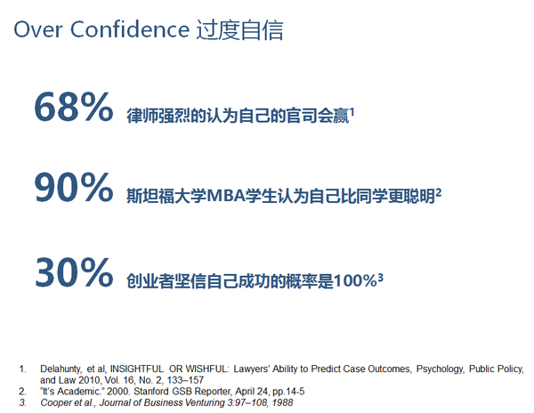 其次,大多數(shù)人都受到“過于自信的偏見(Over confidence bias)”的影響。過度自信偏見是指人們的習(xí)慣性過高估自己的技能和成功的機(jī)會(huì)。例如,上面的圖例中有不少過度自信的例子。