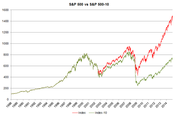 上圖顯示了從1988年到2014年標(biāo)普500指數(shù)(紅線)在27年的時(shí)間里的回報(bào),總共有6,824個(gè)交易日。