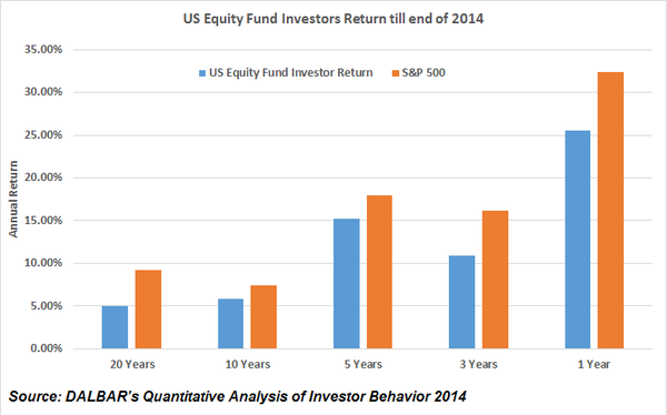 在1995年至2014年的20多年間,股票型基金的投資者在美國(guó)每年的平均回報(bào)率是5%,而標(biāo)普500在同一期間每年回報(bào)9.22%。債券型基金的投資者平均每年獲得了0.71%的回報(bào),而同期年通脹率為2.37%,全球債券指數(shù)的回報(bào)則達(dá)到了每年5.74%。不管是股票還是債券基金投資者,其回報(bào)都遠(yuǎn)遜于呆而不動(dòng)的傻瓜型投資策略。