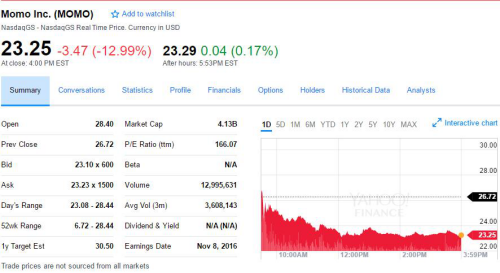 陌陌發(fā)布第三季度財報當天,股價一路下滑近13%,跌破其50日均線