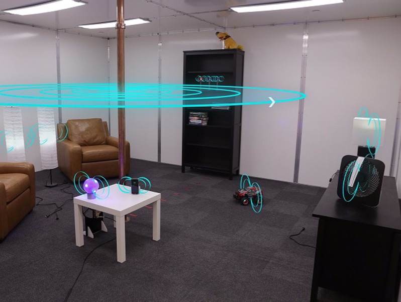 這樣聽起來可能有些晦澀難懂,我們不妨將金屬容器想象成一個54立方米的空間,這樣的空間規(guī)格接近美國大部分家庭的客廳。迪士尼研究中心已在54立方米的空間內(nèi)做了測試,在1.32MHz頻率下QSCR這樣的方式可以安全的傳輸高達1900w的有效功率,而波谷效率為40%,而峰值數(shù)據(jù)高達95%。除了移動設備外,研究人員也拿智能電燈、智能電扇等進行測試,測試結(jié)果顯示,這些智能設備都可以接受這樣的充電功率。換句話說,迪士尼研究中心相當于是在一個空間內(nèi)營造了一個無線充電的環(huán)境。