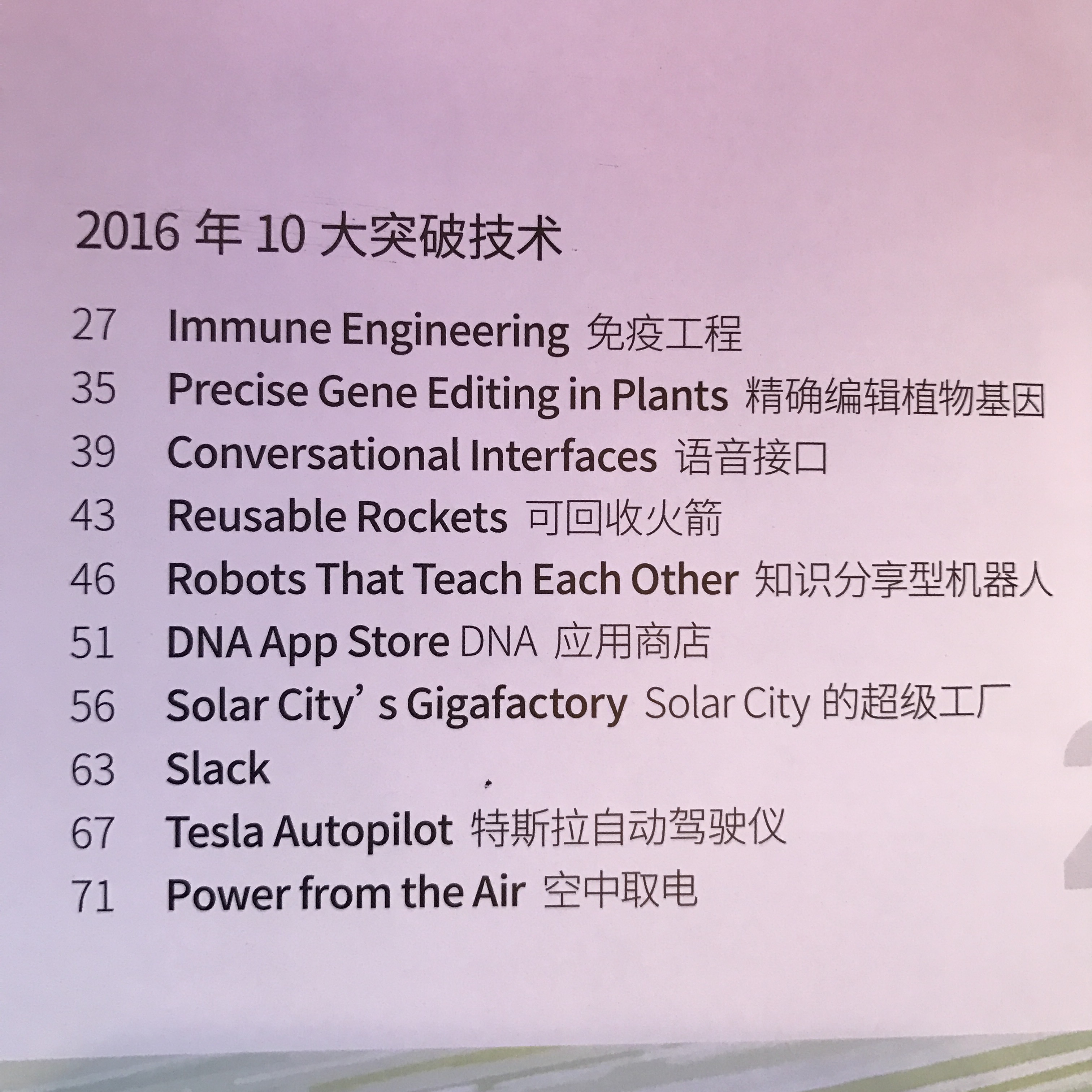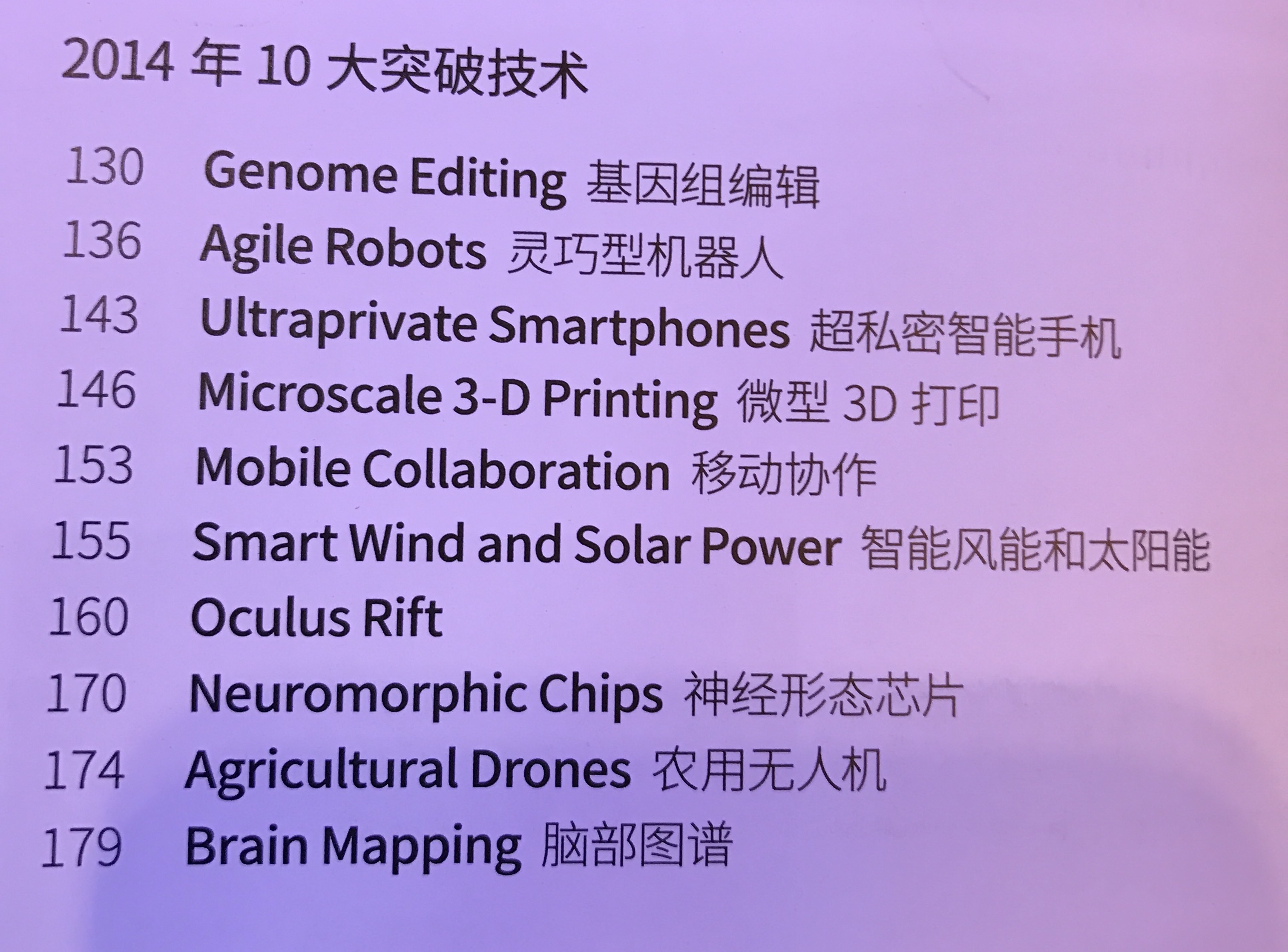 2016年:(以下圖片拍自《麻省理工科技評論》出版的《科技之巔》一書,由中國工信出版集團和人民郵電出版社出版)