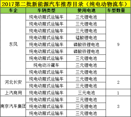 2017年3月1日發(fā)布的第二批新能源汽車推薦目錄中,共有13家企業(yè)29款純電動物流車,其中25款車型選用三元鋰電池,3款車型選用磷酸鐵鋰電池,1款選用錳酸鋰電池,如下表所示: