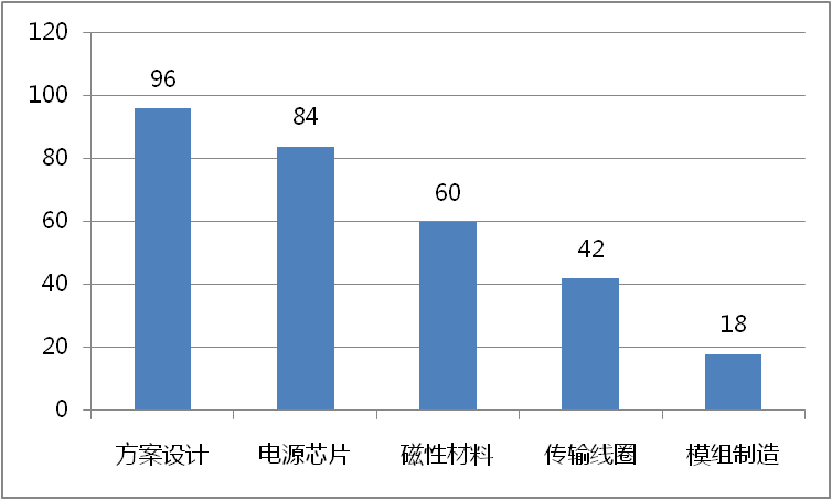 雖然無(wú)線充電技術(shù)是以不同終端產(chǎn)品的形態(tài)展現(xiàn)在消費(fèi)者面前,但其實(shí)無(wú)線充電功能的實(shí)現(xiàn)包含多個(gè)技術(shù)點(diǎn),即其產(chǎn)業(yè)鏈包含多個(gè)環(huán)節(jié)。大致來(lái)講,無(wú)線充電產(chǎn)業(yè)鏈從上游到下游,包括以下五個(gè)環(huán)節(jié):電源芯片、磁性材料、傳輸線圈、模組制造、方案設(shè)計(jì)。其中方案設(shè)計(jì)和電源芯片環(huán)節(jié)技術(shù)壁壘高、利潤(rùn)高(大概各占無(wú)線充電產(chǎn)業(yè)鏈利潤(rùn)的30%),基本被國(guó)外企業(yè)壟斷。磁性材料和傳輸線圈環(huán)節(jié)技術(shù)壁壘相對(duì)較低,同時(shí)擁有中外玩家,利潤(rùn)占比各為20%和14%。模組制造環(huán)節(jié)技術(shù)壁壘和利潤(rùn)最低,主要參與者為國(guó)內(nèi)廠商,廠商利潤(rùn)占比僅為6%。