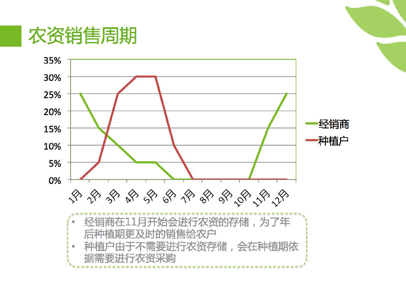 經(jīng)銷商為了及時的,更好的給種植戶提供農(nóng)資,會在年前進行農(nóng)資存儲,主要的存儲時期是 10 月到第二年的 2 月左右,這幾個月是各個經(jīng)銷商進行大量存儲農(nóng)資的時期,同樣也是農(nóng)資生產(chǎn)企業(yè)的主要銷售周期。隨著種植期的不斷推進,經(jīng)銷商的庫存不斷被消化,進而完成了本地農(nóng)資倉儲的銷售工作。